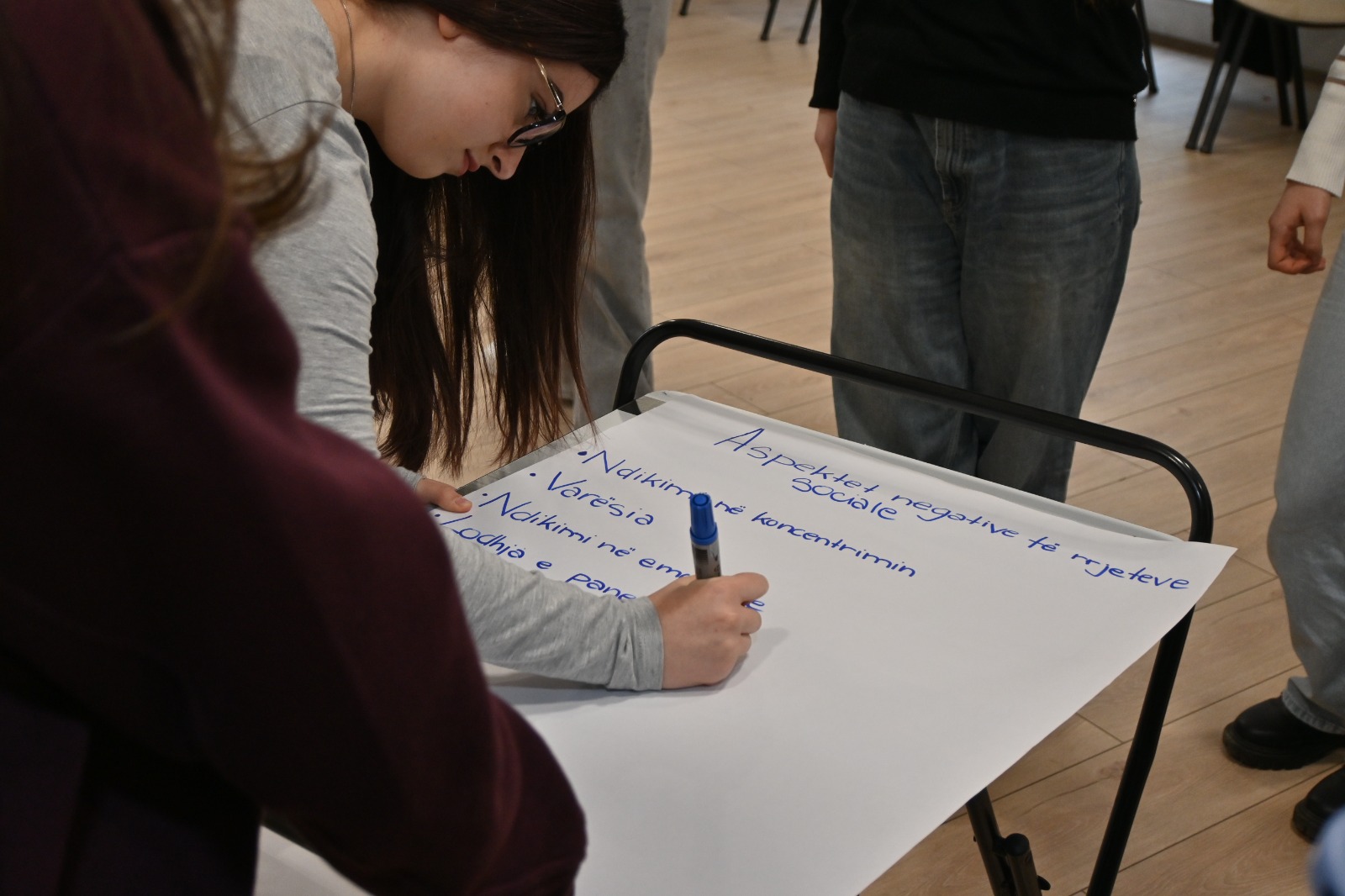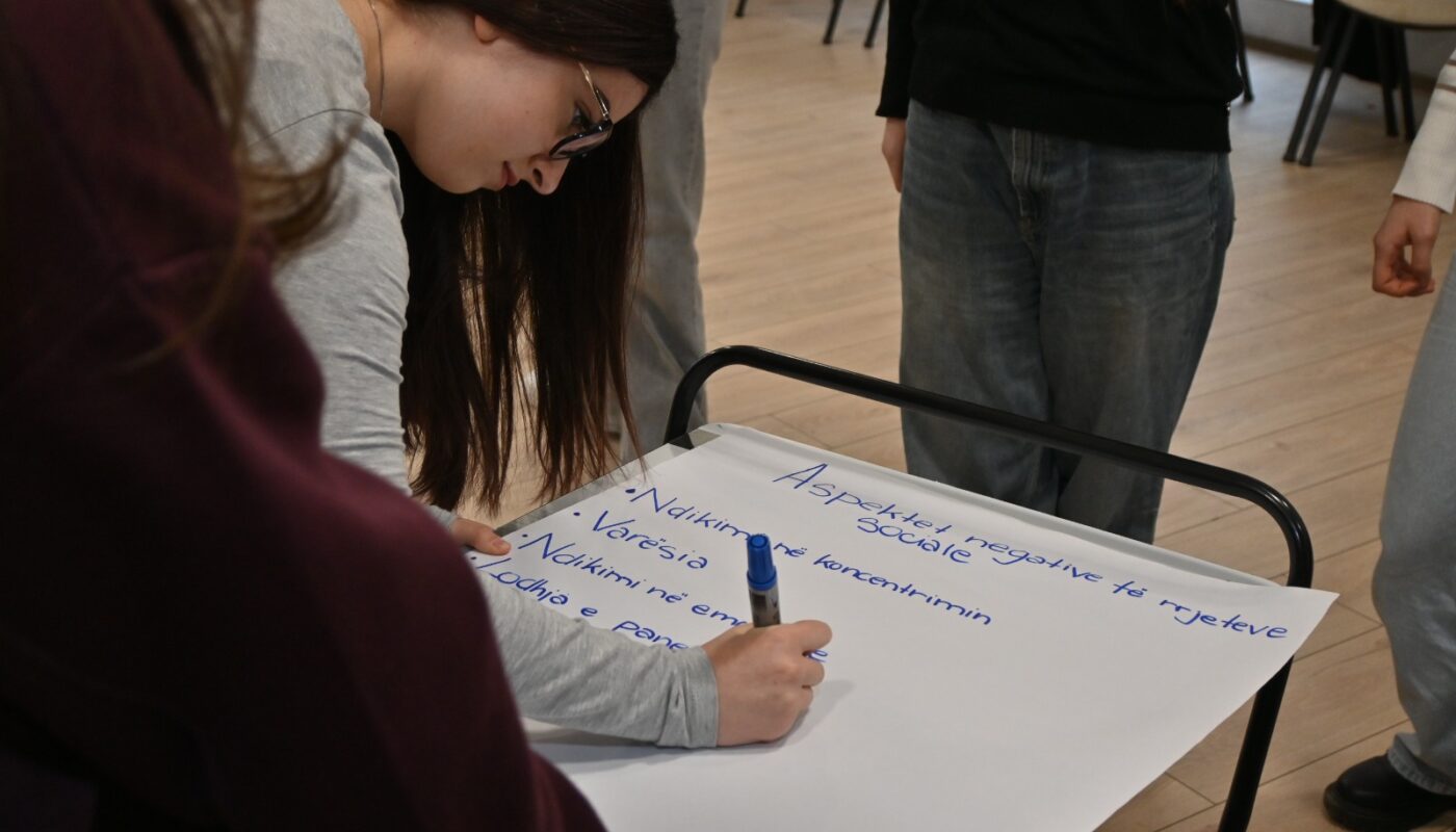 Më pas, ligjëruesi trajtoi temën “Ndikimet e rrjeteve sociale”, duke u ndalur në ndikimet pozitive dhe sfidat që ato paraqesin në jetën e përditshme të të rinjve, si dhe duke i inkurajuar për një përdorim të ndërgjegjshëm dhe të balancuar të tyre. Pjesëmarrësit u ndanë në grupe pune, ku diskutuan mbi ndikimin e rrjeteve sociale në komunikim, edukim dhe aktivizëm rinor, si dhe mbi ide konkrete për aktivitete të ardhshme. Takimi u përmbyll me një lojë njohëse, me qëllim forcimin e lidhjeve dhe krijimin e një atmosfere sa më miqësore mes nxënësve.